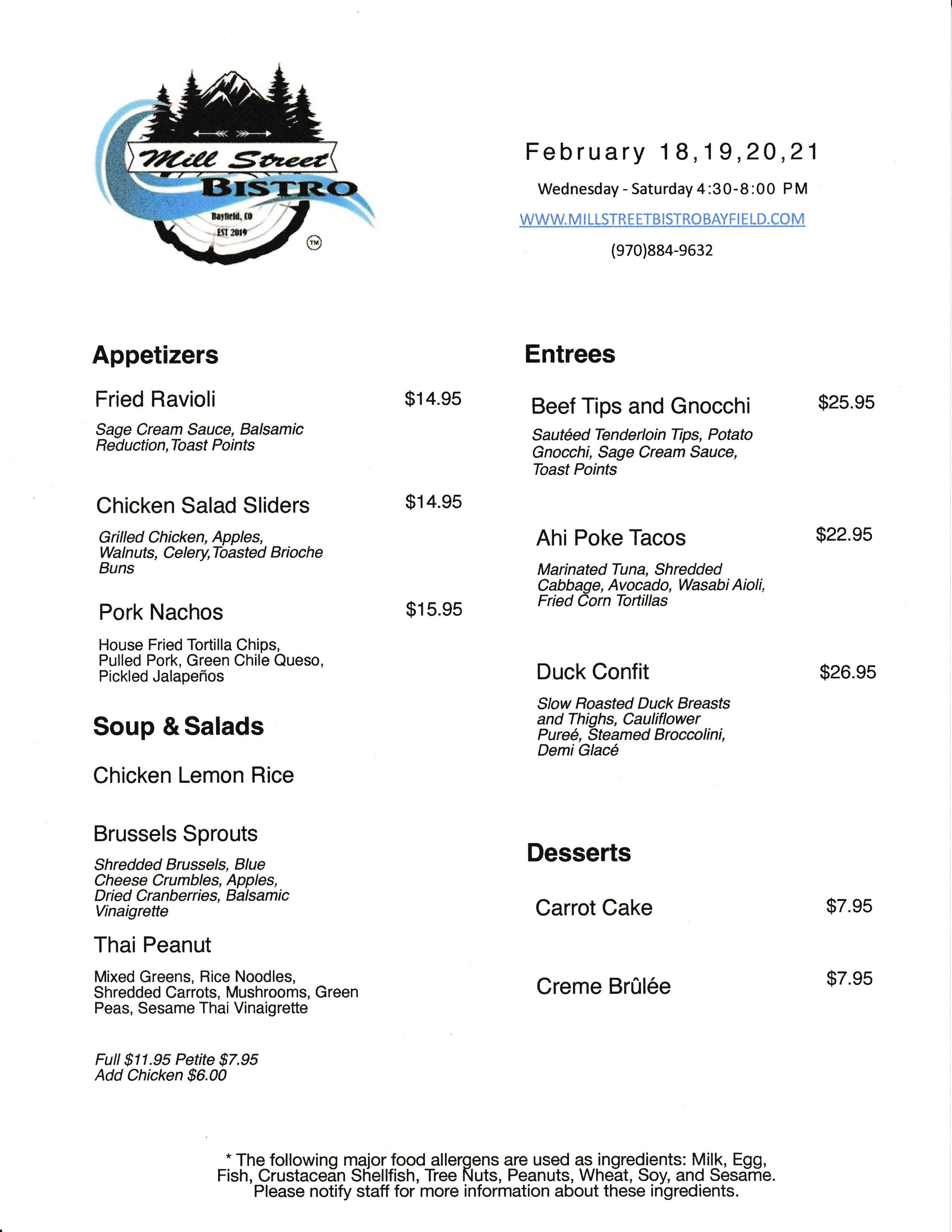 Please call us at 970-884-9632 or email us at millstreetbistro@gmail.com to place your order or schedule your dining reservation. We look forward to serving you!